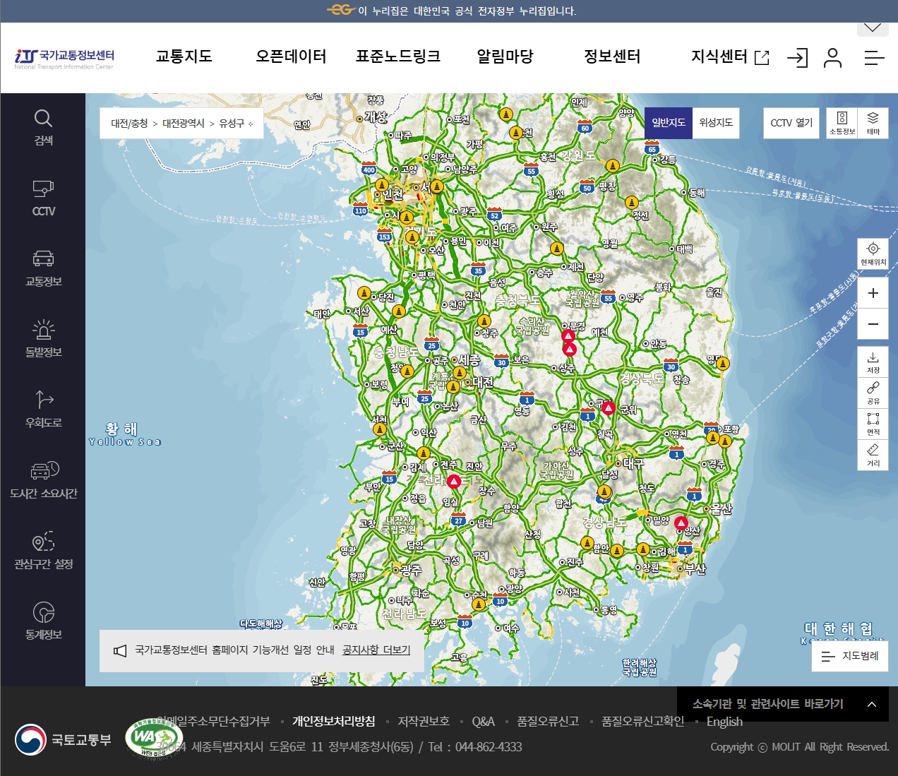 국토교통부에서 운영하는 ITS 국가교통정보센터는 우리나라 전국 도로의 실시간 교통정보를 제공하고 있습니다.