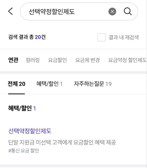 메뉴 검색창에 선택약정을 입력하면 하단 부분에 선택약정할인제도 항목을 확인할 수 있고 해당 항목을 터치하면 해당 메뉴로 이동할 수 있습니다.