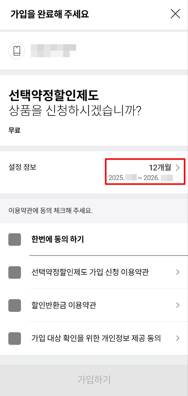 다음 단계에서 선택약정할인 기간을 제대로 입력하셨는지 확인하고 이용약관에 동의해주시면 가입이 가능합니다.