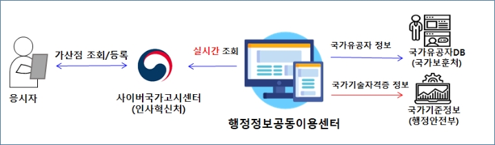 인사혁신처는 2019년 8월 부터 '공무원 채용시험 가산점 실시간 조회 시스템'을 구축하여 운영하고 있습니다. 이 시스템을 통해 응시자는 본인이 보유한 자격증과 취업지원 가산점의 유효 여부와 가산 비율을 실시간으로 직접 확인하고 등록할 수 있습니다.